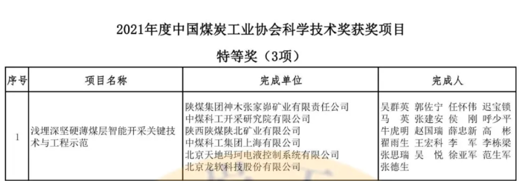 2021年12月10日,中國煤炭工業協會2021年度科學技術獎獲獎名單頒布,北京龍軟科技股份有限公司喜獲特等獎一項、一等獎一項、三等獎一項。